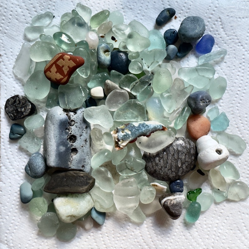 I spent a couple of hours glass hunting on the beach today, along with Mark and his pug, Meatball, who I’d met a few weeks ago. It was lovely to get some fresh air and chat with a new friend. My haul was quite impressive too.