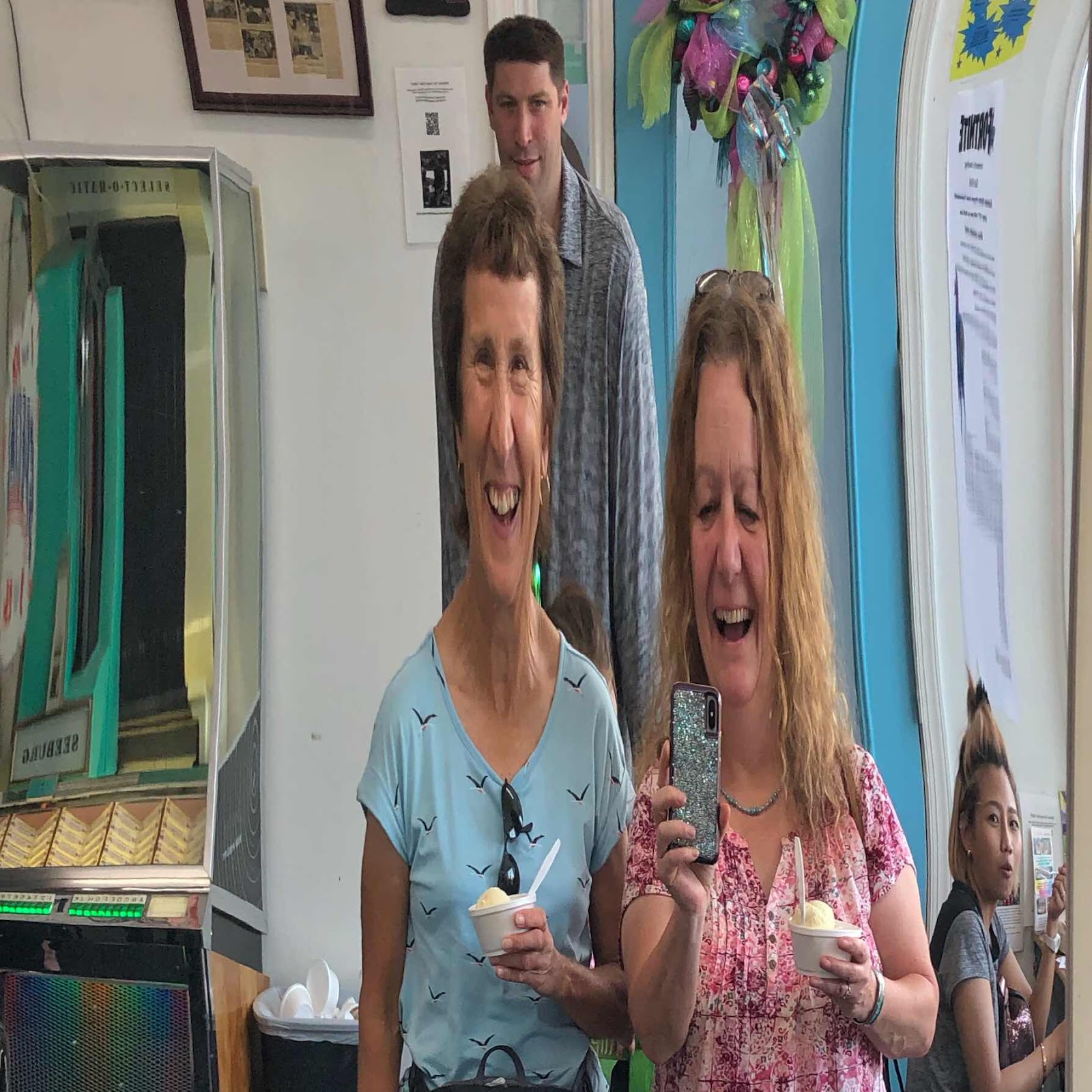 Janice and I at the local ice cream shop which had a fun mirror. And we got photobombed.