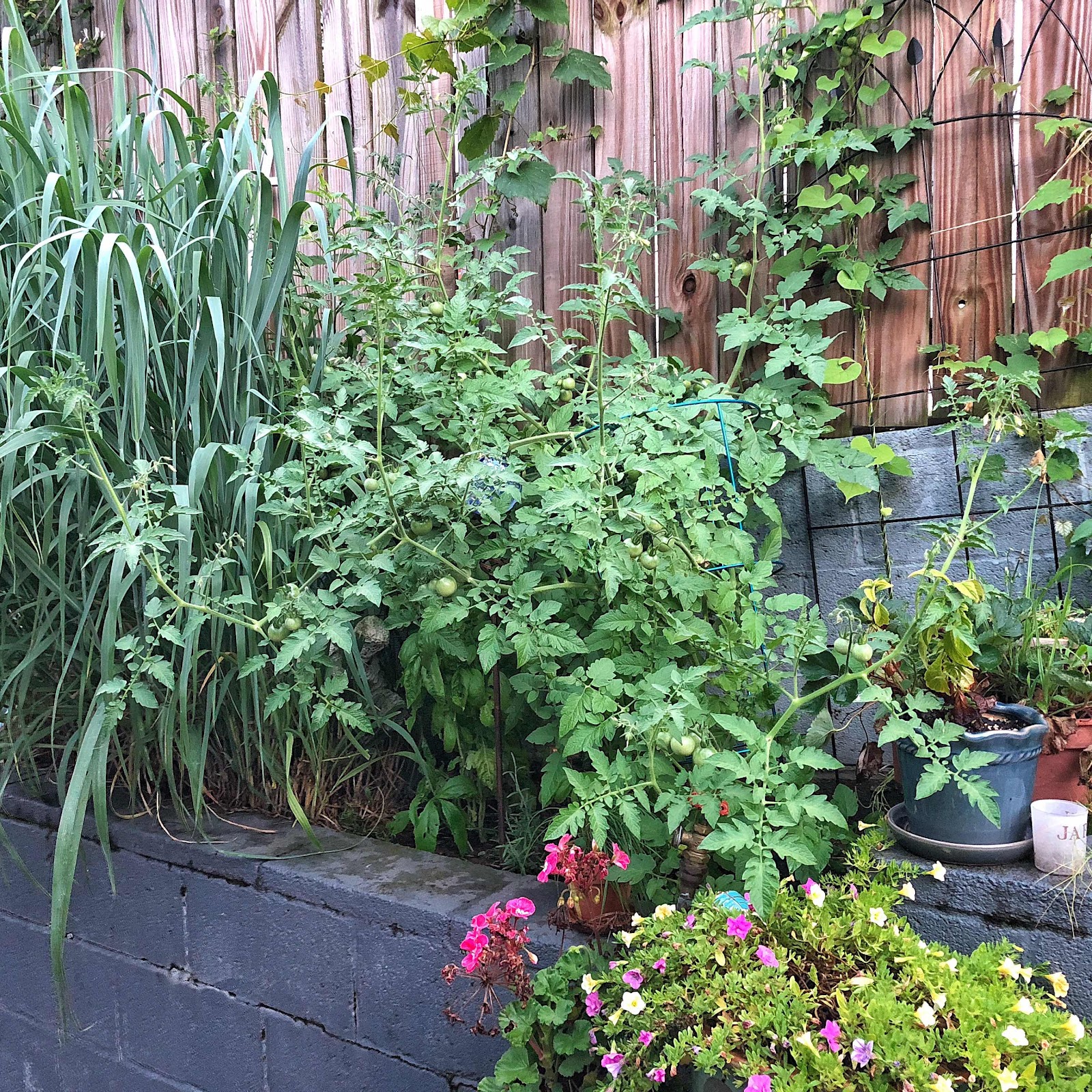 This tomato plant has gone nuts, I’ve never had one grow this big before, it’s become a tree! And that’s basil growing under it.