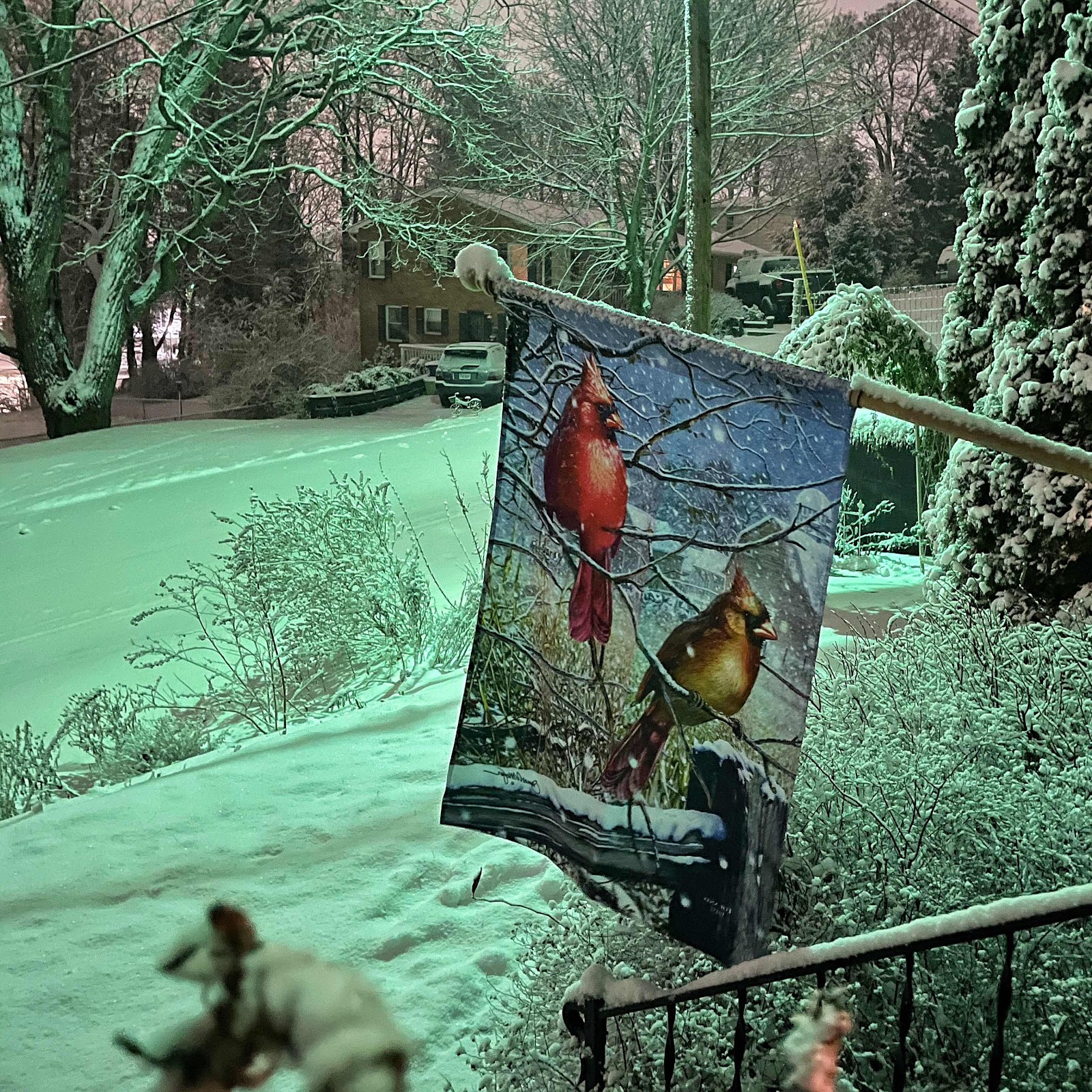The cardinals and snow flag finally looking in place after the snowfall today.