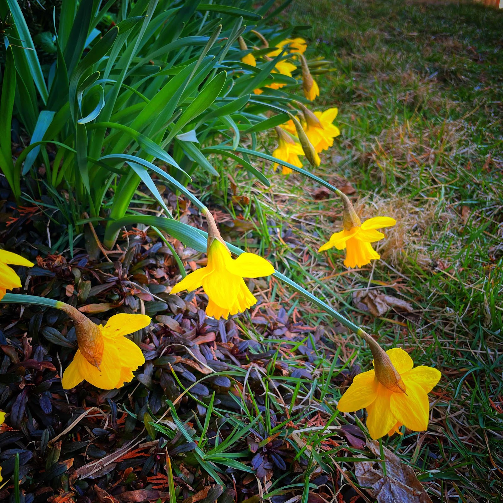 My poor daffodils got weighed down with the snow on Saturday, yet they’re still blooming and remaining vibrant. Hopefully they’ll reassert themselves and get upright again. Beautiful blooms heralding in the spring.