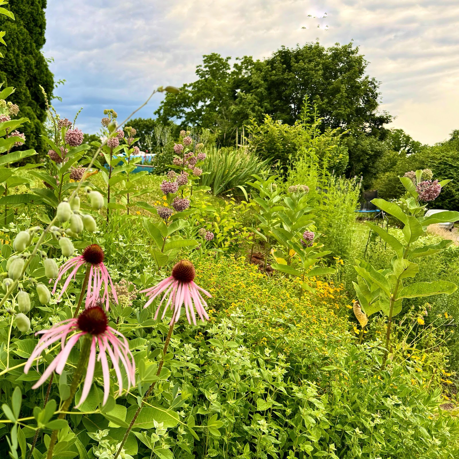 The cone flowers and milkweed are in full bloom, but no monarch caterpillars yet.