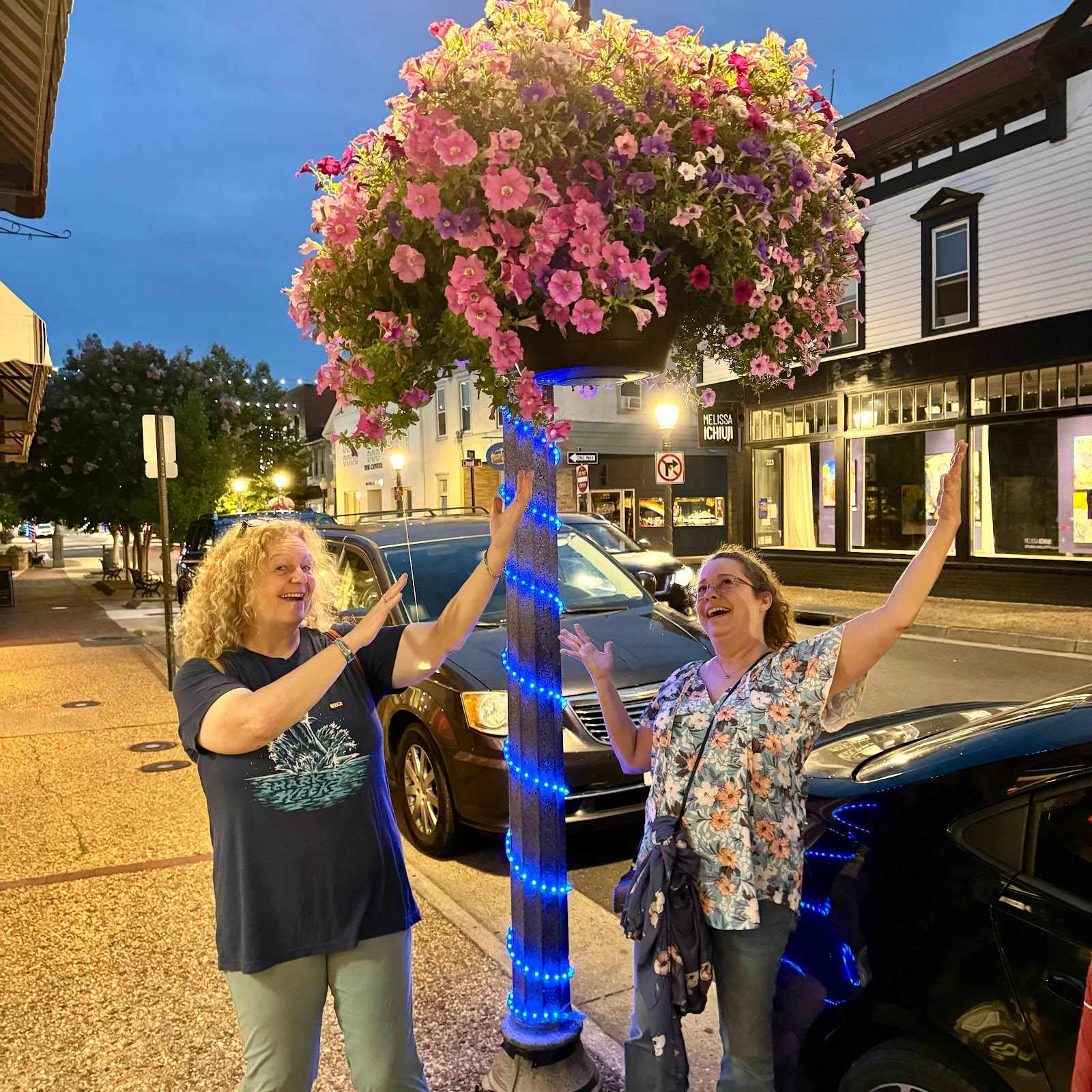 Me and Lisa admiring the fabulous petunia pots on Main St in FroRo.