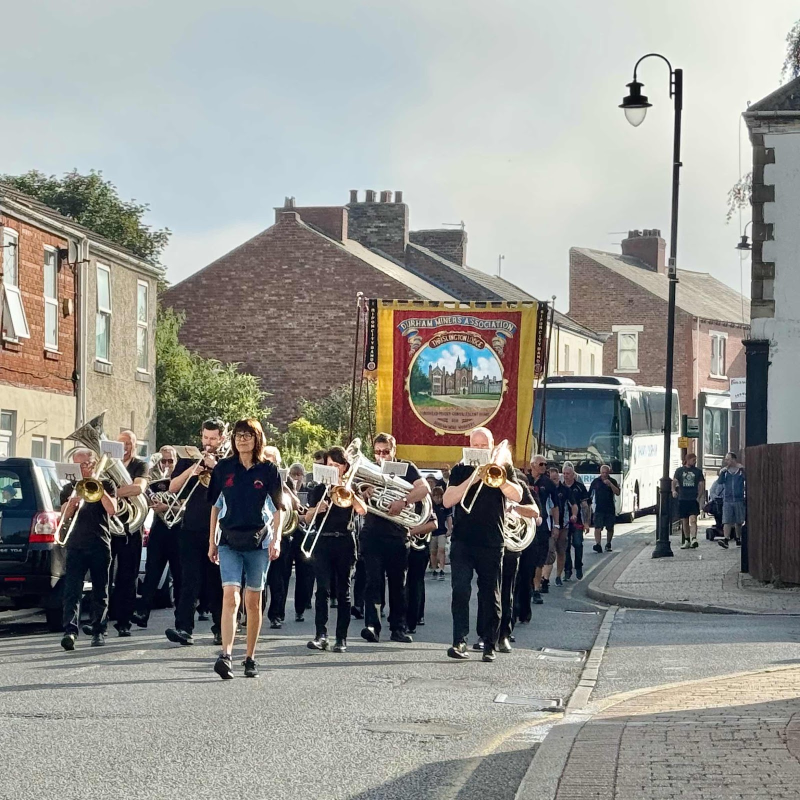 Early morning in the village with the Ripon City Band and our mine banner before getting on the coach to march at the Durham Miners Gala.