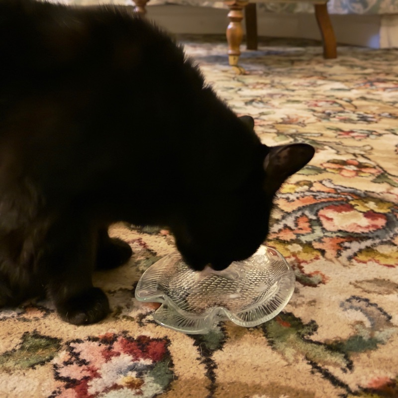 Both Mr Blue Skye and Tricksie Treat like yoghurt. Here is TT enjoying her teaspoonful of oat and walnut Activia.