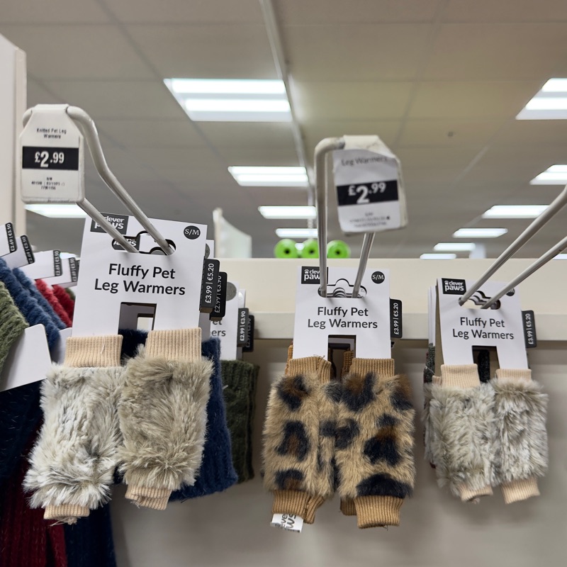 I saw these today and had a chuckle. The pet dressing business has gone a bit far, but there’s plenty that have money to waste on such trivialities. Poor pets!