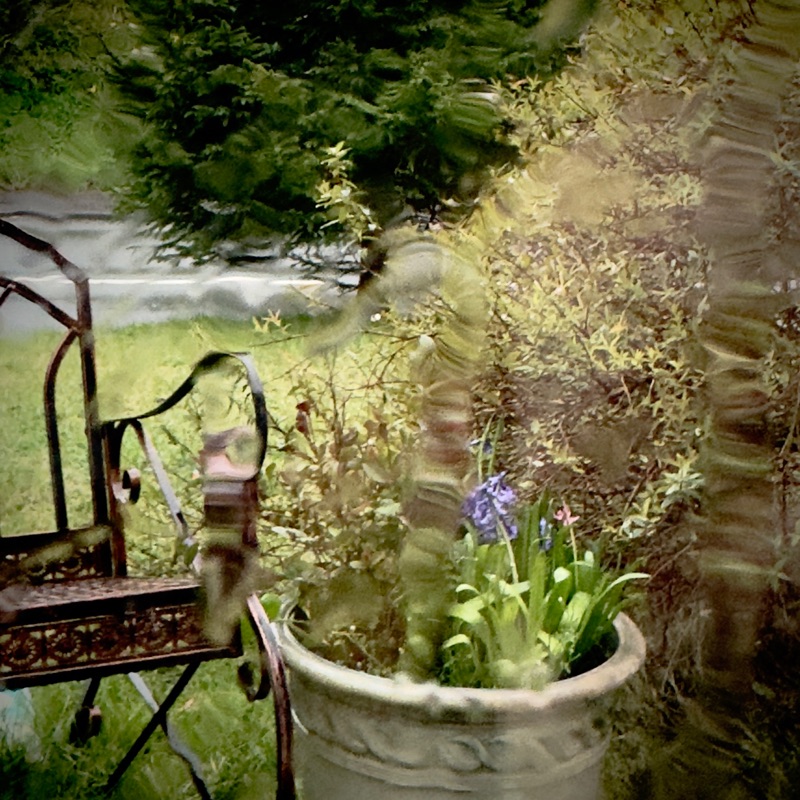 A day of heavy winds and rain. Looking out to the garden through a rain-streaked window.