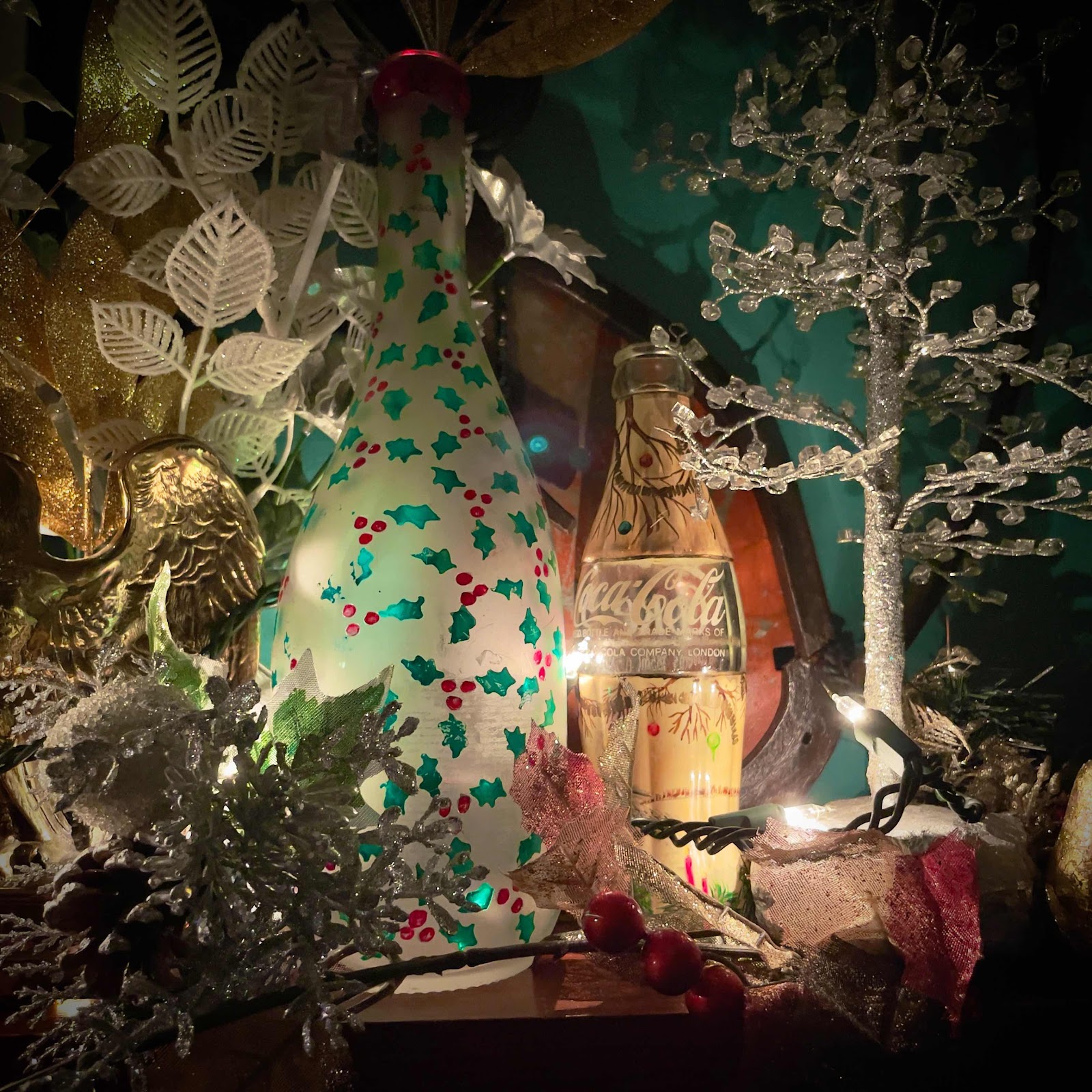 Bottles that I painted as a teenager, I still love to pull them out every Christmas, and this year are on the mantle piece.